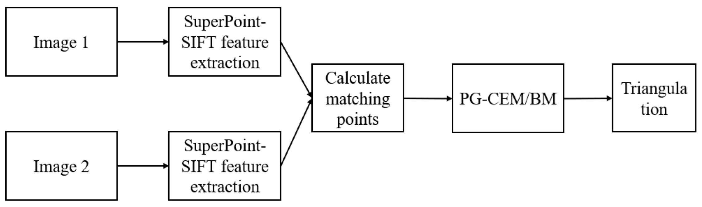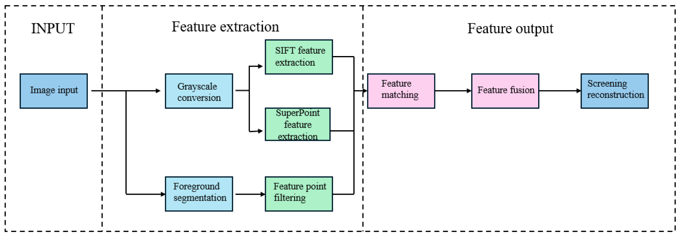 18]: (1) SuperPoint-SIFT feature detection, (2) feature point matching, (3) essential/fundamental matrix estimation via epipolar geometry, and (4) triangulation-based 3D point-cloud reconstruction. Our approach synergizes traditional SIFT features with deep learning-based SuperPoint features to enhance feature extraction for subsequent 3D reconstruction.