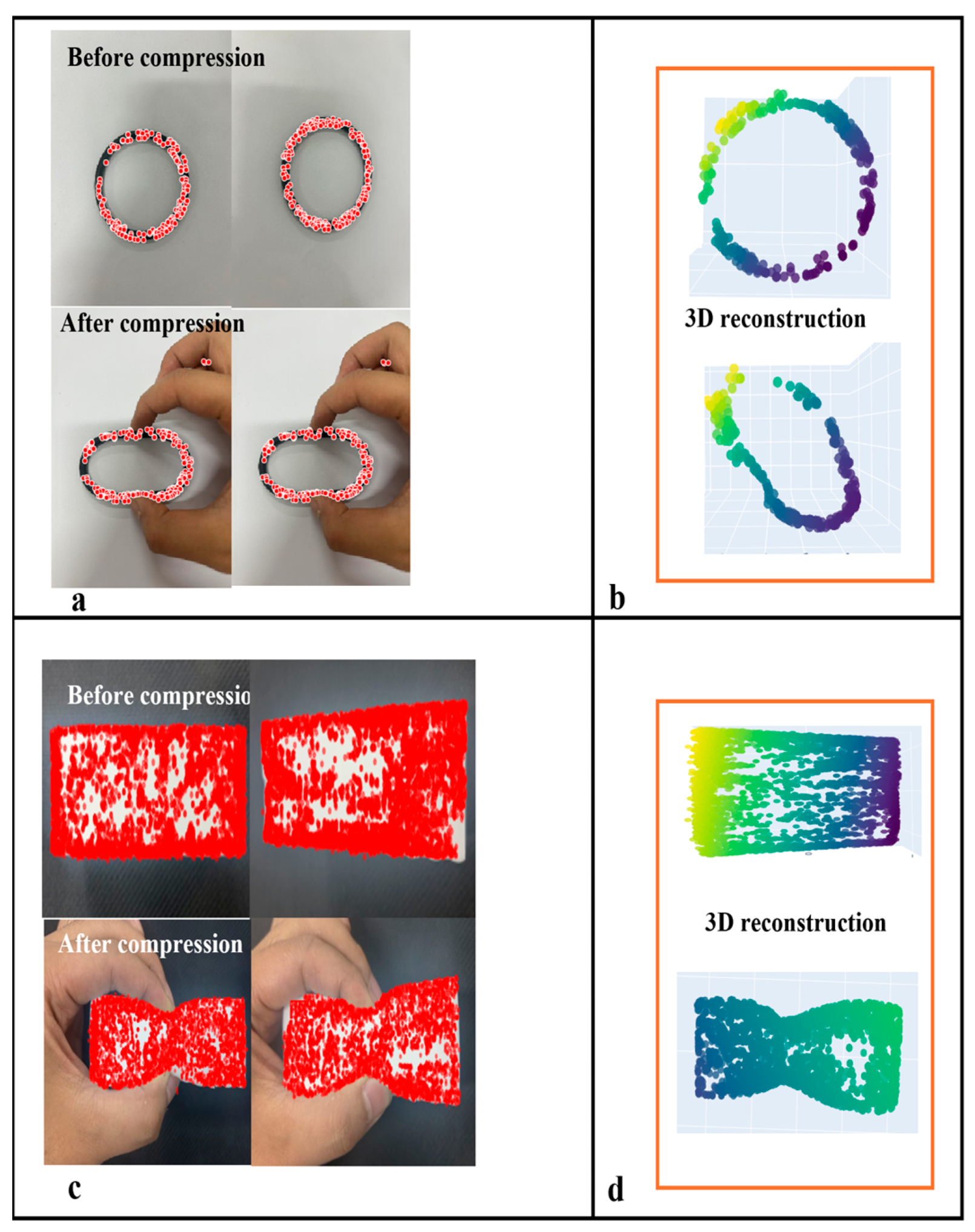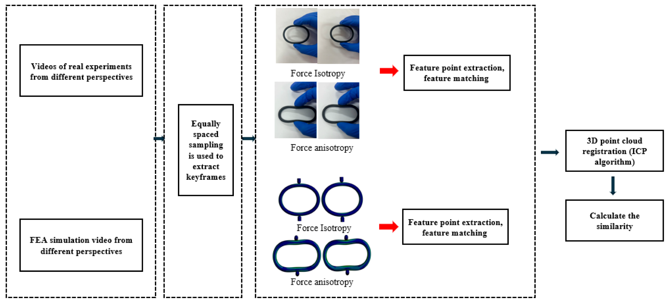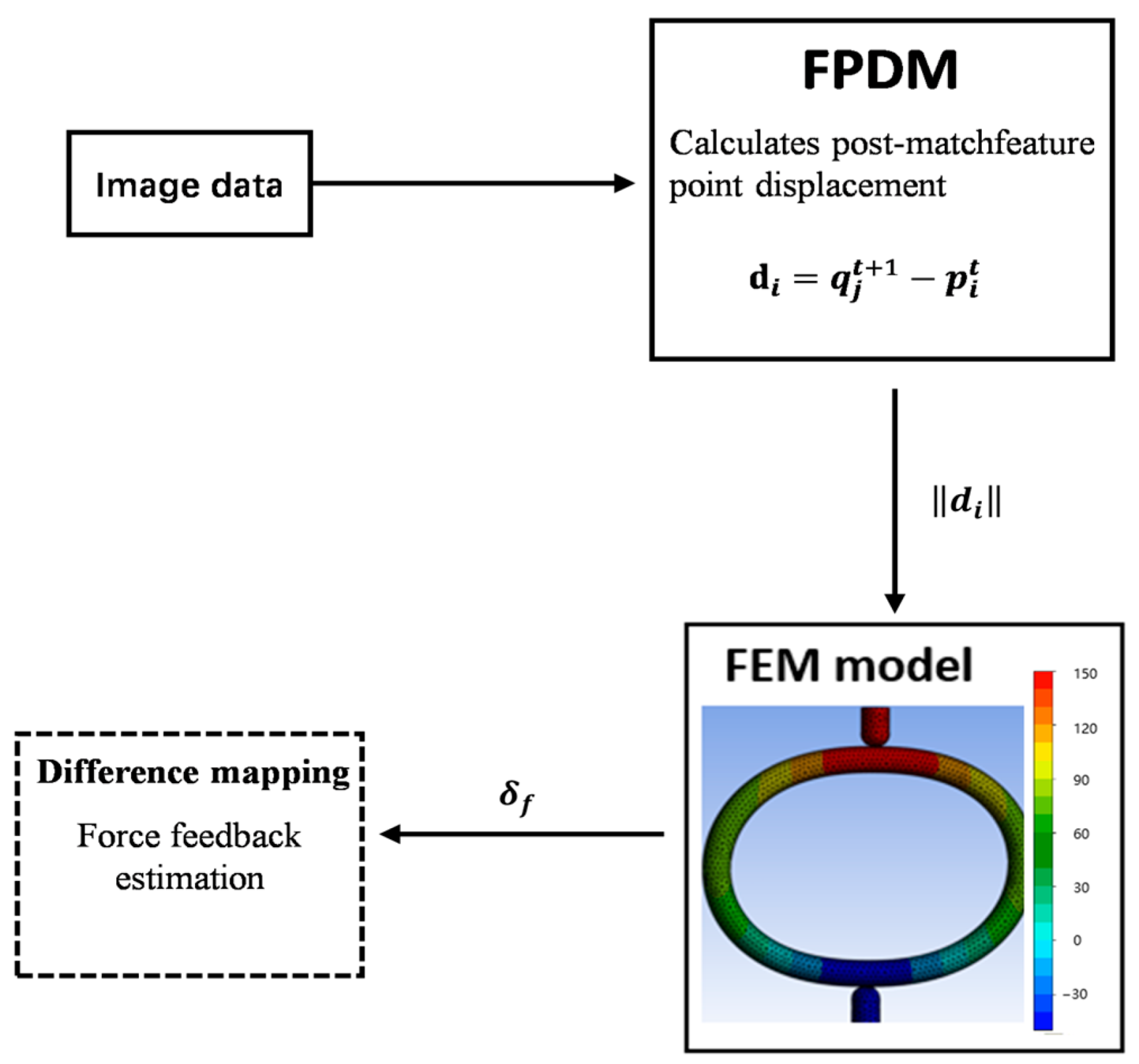 19], thereby substantially improving the feature-matching robustness and computational efficiency in complex environments. (2) We establish a complete closed-loop system, bridging visual features with mechanical analysis. The feature-fusion outputs are transformed into displacement boundary conditions for FEA via 3D displacement field reconstruction, enabling solutions to nonlinear mechanical problems and achieving cross-domain mapping from an image’s feature space to its physical-parameter space. (3) We developed a dynamic video-sequence-based mechanics-detection approach: feature point displacement fields decode object deformation dynamics, and a video similarity comparison mechanism noninvasively validates the spatiotemporal consistency between FEA simulations and real-world deformations. This framework eliminates the reliance on conventional pressure sensors, and requires only standard cameras and algorithms without complex sensors or markers. Its cost-effectiveness and operational simplicity render it particularly suitable for marker-free natural scenarios, offering a universal solution for external force detection in applications such as precision assembly and medical robotics.