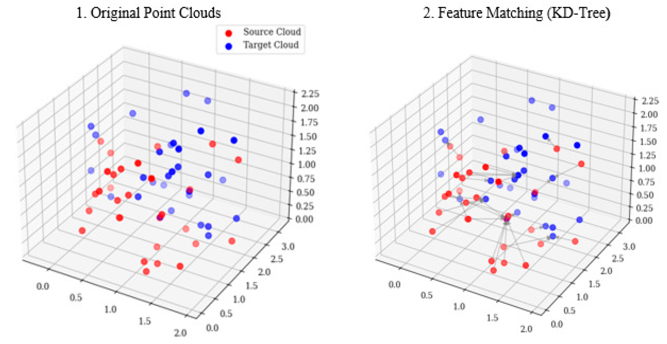 d2 denote the distances to the first- and second-nearest neighbors, respectively. The matches output contains correspondence lists with DMatch objects indicating best/second matches in the target images, where smaller distances imply higher feature similarity. Point cloud registration aligns 3D features from multiple views into a unified coordinate system via (1) a KD-tree-based nearest-neighbor search to establish the initial correspondence between point clouds