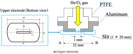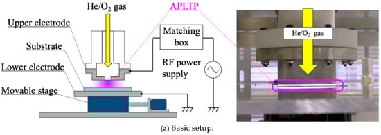 The PMMA-coated substrate was irradiated with atmospheric-pressure low-temperature plasma. Figure 1 presents the plasma treatment equipment diagram. The He gas (≥99.99%; Takamatsu Teisan Co., Takamatsu, Kagawa, Japan) flow rate was fixed at 2.0 slm using a mass flow controller (SEC-400MK3; STEC Inc., Toda, Saitama, Japan). The O2 gas (≥99.5%; Iwatani Sangyo Corp., Minato, Tokyo, Japan) flow rate was fixed at 60 sccm using another mass flow controller (SEC-E4; HORIBA STEC Co., Ltd., Kyoto, Japan). The He/O2 mixture was introduced into an upper electrode. The bottom area of the upper electrode was 32 × 52 mm2. The upper electrode had a slit. The slit size was 1 × 20 mm. The mixture flowed out from the slit. The distance between the upper electrode and substrate was 0.7 mm, and the distance between the upper and lower electrode was 1.7 mm. The RF power supply (RP-200-27M; Pearl Kogyo Co., Ltd., Osaka, Japan) and auto matching box (ZDK-916S-2 and M-05A2VD-27M; Pearl Kogyo Co., Ltd., Osaka, Japan) were used to generate an atmospheric-pressure low-temperature plasma. The RF power was 120 W. Its frequency was 27.12 MHz. The stage, on which the lower electrode was placed, could be moved by an electrical motor. The plasma irradiation time per irradiation was 5 s. The cooling time after irradiation was 15 s. This represented one set, which was repeated several times. A small thermocouple (ST-56 K-CA 0200 N-N; RKC Instrument Inc., Otaku, Tokyo, Japan) was used for surface temperature measurement during plasma irradiation. The substrate after plasma treatment was placed in the oven at 120 °C for 5 days [59,60]. This heat treatment process is called annealing herein.