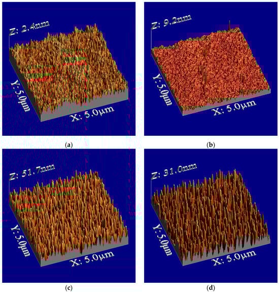 The surface profile after irradiation was examined using atomic force microscopy (AFM, Veeco Dimension Icon; Veeco Instruments Inc., Plainview, NY, USA). The tip height of the cantilever (Veeco NCHV-W; Veeco Instruments Inc., Plainview, NY, USA) was 10–15 µm, and the tip curvature radius was less than 15 nm. The tip shape was a square pyramid with a forward angle of 25° and a backward angle of 10°. The relation of the surface area to the surface roughness to the plasma irradiation condition was evaluated. The evaluation area of AFM was 5 × 5 μm2 with a resolution of 512 × 512 points. The surface roughness was analyzed based on AFM results obtained using WSxM [61]. Before the analysis, each AFM image was digitally treated with parabolic flattening, to suppress three-dimensionality and bow effects.