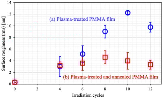 Relationship between the number of irradiation cycles and the film thickness. (a) Plasma-treated PMMA film (○, blue circle) and (b) plasma-treated and annealed PMMA film (□, red square).