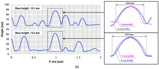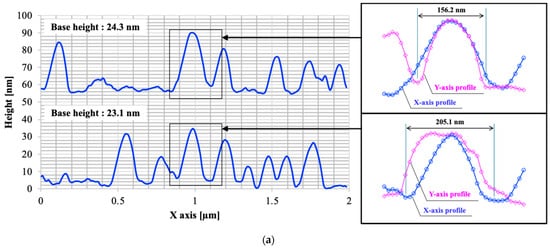 The increase in RMS roughness may be influenced by the average height and pitch of the microstructure. Figure 4 illustrates the line profiles of the PMMA film surface after 10 irradiation cycles. As shown in Figure 4, the nanospike height was several tens of nanometers, and the pitch was about 150–200 nm. The substrate surface temperature rose to approximately 150 °C during plasma irradiation with 5 s. This heat must soften the nanospike structure with the increase in irradiation cycles. Neighboring nanospike structures may coalesce, resulting in an increase in pitch. Annealing treatment further flattened the surface. The nanospike height was several tens of nanometers, but the pitch was about 200–300 nm. The average height depends on the base height. A decrease in base height was also observed, which may be ascribed to pore blocking.
