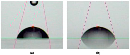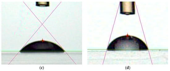 Photographs of contact angle measurement for PMMA films. (a) Untreated PMMA film, (b) annealed PMMA film, (c) plasma-treated (6 cycles) PMMA film, and (d) plasma-treated (6 cycles) and annealed PMMA film. The horizontal green line indicates the substrate surface. The perple line indicates the tangent line drawn to the contour (arc) of a water droplet in contact with the surface.
