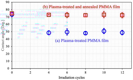 Figure 5 presents photographs of contact angle measurements for PMMA films, while Figure 6 illustrates the dependence of the contact angle on plasma irradiation cycles. The surface treated only with plasma was hydrophilic. This hydrophilicity was almost independent from the surface roughness shown in Figure 3. Generally, hydrophilicity induced by microstructures is often explained using the Wenzel model [62]. The increased surface area by the formation of microstructures may be too small to affect wettability. In our previous work, we reported that the formation of microstructures results in super-nanohydrophilicity, similar to the surface of a snail’s shell [53,54,55,56,57]. In contrast, the wettability of the surface treated with both plasma and annealing recovered to that of the untreated surface. Gotoh et al. investigated the time course of wettability after plasma treatment and reported that hydrophobicity recovered [63]. One of our ideas is that annealing may promote this recovery. We also discuss the recovery of wettability with another idea later in this paper.