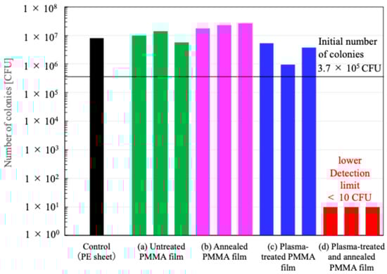 Figure 7 shows the number of colonies on the surface of PMMA films before and after the treatments. The number of colonies on the untreated substrate was comparable to that on the control sheet—polyethylene (PE) sheet. The number of colonies on the annealed film was similar to that on the untreated one. The average number of colonies on the plasma-treated film was 30% lower than that on the untreated one. Unfortunately, on these films, the number of colonies increased rather than the initial count. In contrast, the film annealed after plasma treatment exhibited a colony count at the detection limit (<10 CFU). This film achieved an antibacterial activity value greater than 5 with respect to the colonies of the untreated film. High antimicrobial performance was demonstrated. We discuss antimicrobial performance later in this paper.