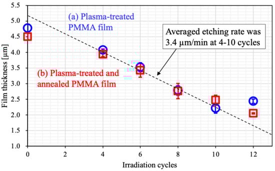 Figure 8 presents the effect of PMMA film thickness on APLTP irradiation cycles for the plasma-treated PMMA film and plasma-treated and annealed PMMA film. The initial film thickness is represented by the value at zero irradiation cycles. Before annealing, the film thickness was 4.75 µm. After annealing, it decreased slightly to 4.50 µm. However, no horizontal shrinkage was observed. There was no peeling or warping of the film. The volume shrinkage was about 5% because the thickness shrinkage was about 0.25 µm. This reduction in thickness must be attributed to the shrinkage of the PMMA film caused by the heating during the annealing process. No further decrease in film thickness was observed after four or more irradiation cycles, both before and after annealing, suggesting that the surface side of the PMMA film may be more susceptible to shrinkage. The etching rate, about 3.4 µm/min, was determined for irradiation cycles ranging from 4 to 10, calculated based on the reduction in film thickness relative to the number of irradiation cycles. After 12 irradiation cycles, the observed film thickness deviated from the expected value based on the calculated etching rate. Between 10 and 12 cycles, a decrease in the etching rate was observed, perhaps indicating an increase in the density of the PMMA film at below 2 µm in thickness.