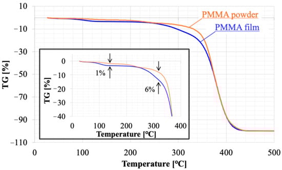 Results of thermogravimetry (TG) analysis; one is a raw powder sample of PMMA film (orange line) and the other is a sample recovered from PMMA film (blue line).