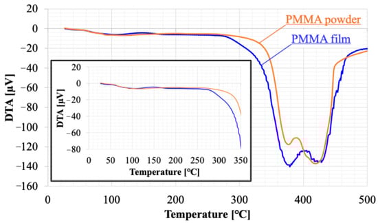 Results of differential thermal analysis (DTA); one is a raw powder sample of PMMA film (orange line) and the other is a sample recovered from PMMA film (blue line).