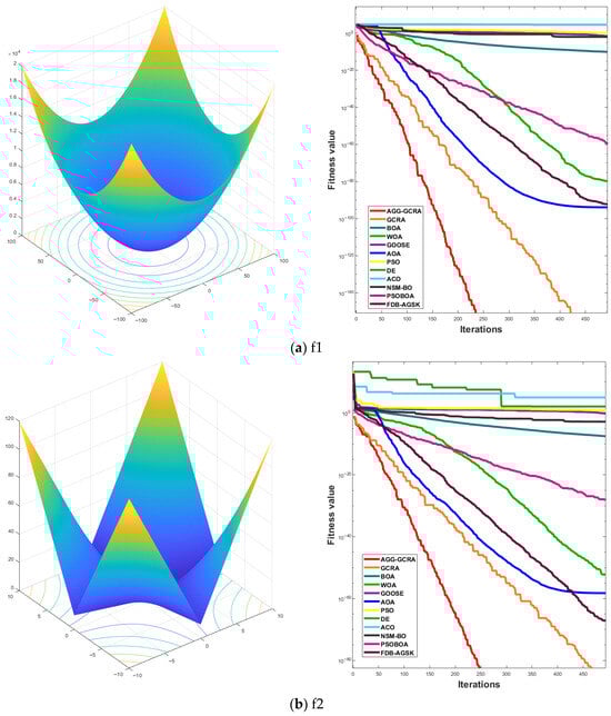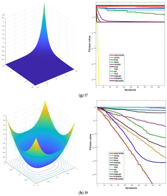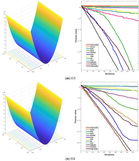 To validate the performance and effectiveness of the proposed AGG-GCRA, this section performs a comparative analysis from two perspectives: standard benchmark functions and practical engineering problems. Specifically, it consists of (1) a comparison with 11 mainstream optimization algorithms on 26 classic benchmark functions, including the GCRA, BOA, WOA, GOOSE, AOA [46], PSO, DE [47], ACO, NSM-BO [48], PSOBOA [49], and FDB-AGSK [50]. The sources of the algorithms are provided in the Appendix A. The parameter configurations for each algorithm can be found in Table 1. For fairness, parameters commonly used across algorithms—such as maximum iterations, population size, and termination conditions—were set according to widely accepted values reported in previous studies, while algorithm-specific parameters were further refined through experimental tuning. This tuning process involved evaluating multiple parameter combinations on representative benchmark functions and selecting those that consistently produced high average performance. Such adjustment of literature-based values ensures that each algorithm performs reasonably and competitively. In Table 1, the term “Agents” denotes the population size, meaning the number of candidate solutions maintained by the algorithm at each iteration; (2) an application verification on six typical engineering optimization problems, followed by a performance analysis compared to the aforementioned algorithms.