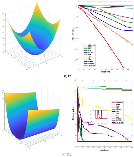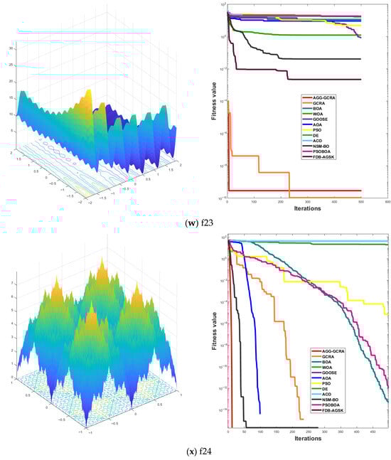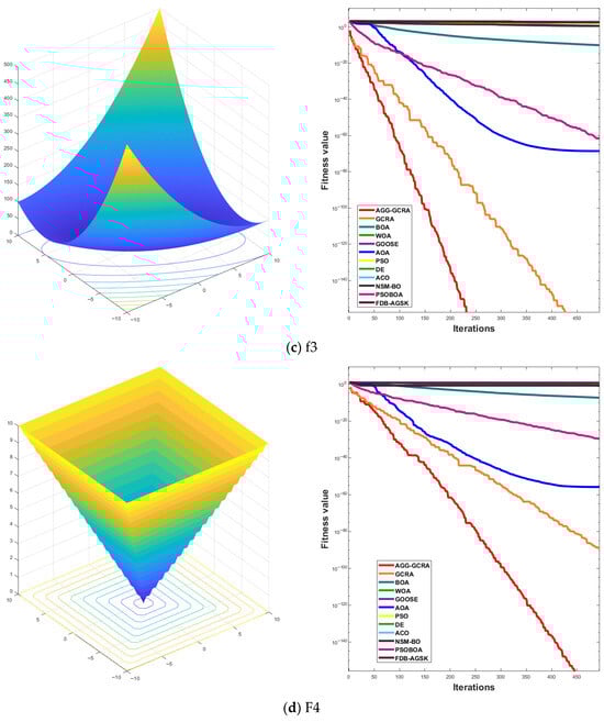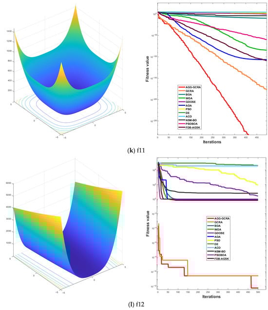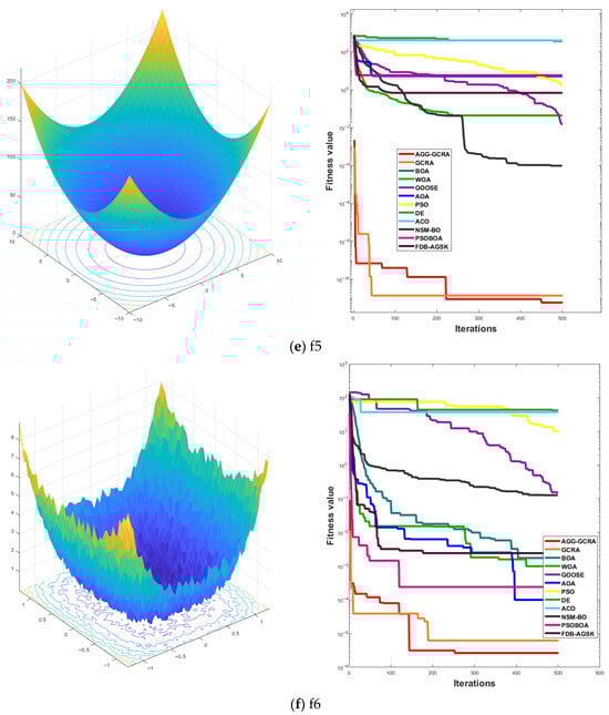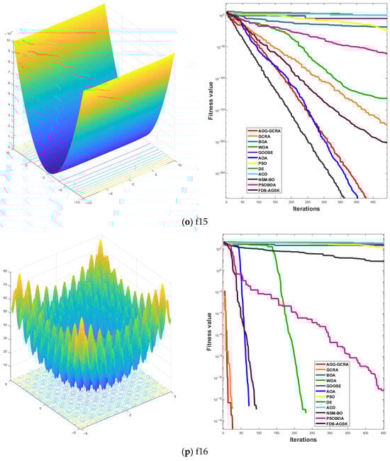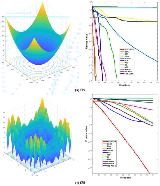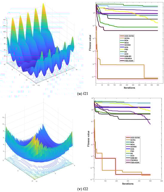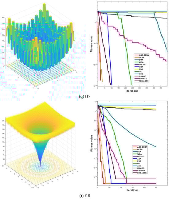 To thoroughly assess the performance of the proposed AGG-GCRA, this paper selects 26 classic test functions as the benchmark set [51,52,53,54,55,56]. These test functions are widely used in metaheuristic optimization, because they effectively reflect the characteristics and difficulty of various optimization problems, making them a crucial tool for validating algorithm performance.
