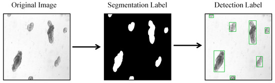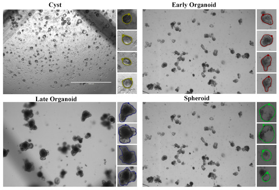 To comprehensively evaluate our proposed method, we utilized two mouse organoid datasets with distinct characteristics and challenges: Mouse2Org and TelluOrg. The first, Mouse2Org, is a binary-class detection dataset containing 508 images [26], with its annotations converted from a semantic segmentation project; this conversion process is illustrated in Figure 1. In contrast, the TelluOrg dataset introduces a higher level of complexity, comprising 840 bright-field microscopy images that [27] encompass four distinct developmental stages of organoids, examples of which are shown in Figure 2. All the organoids in this dataset originated from crypts isolated from whole mouse small intestines. Based on clear morphological features, these organoids were manually classified into four categories: Cyst, defined as vesicular structures without any budding; Early Organoid, which has formed one to two crypts; Late Organoid, exhibiting three or more mature budding structures; and Spheroid, an independent spherical category with no apparent crypts. The TelluOrg dataset contains a total of 23,066 annotated instances. Together, these two datasets form a comprehensive evaluation benchmark, spanning from basic binary-class detection to complex, imbalanced, multi-class scenarios.