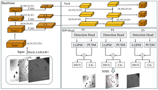 We propose Org-IDPNet, a single-stage detector for high-throughput, high-precision organoid detection, whose architecture carefully balances accuracy and real-time performance (Figure 3). The framework comprises three key components: CSPDarkNet as the backbone for feature extraction, RTMFPN as the multi-scale feature fusion hub, and our custom IDP-Head tailored to organoid characteristics. In the processing pipeline, the input bright-field image first passes through CSPDarkNet, which efficiently generates a feature pyramid embedding rich, multi-level semantic information. This pyramid is then fed into RTMFPN for cross-scale alignment and fusion, ensuring the model simultaneously captures the macro-structures of large, mature organoids and the fine details of nascent, smaller organoids. The fused feature maps are finally processed by IDP-Head, where they undergo two parallel, complementary enhancement modules: LGPM, which captures long-range dependencies and global morphology in the spatial domain, and PCSM, which models inter-channel semantic relationships in a fine-grained manner. Outputs from these two modules are merged via element-wise addition to produce enriched feature representations combining both macro- and micro-level cues, which are then passed to parallel classification and regression branches to predict organoid classes and their bounding boxes.