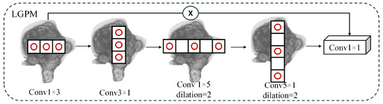 The LGPM is designed to simulate a large receptive field using efficient depthwise convolutions. It first applies two separable convolutions along horizontal and vertical directions: