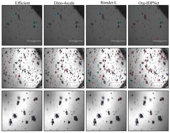 This study conducts a detailed comparison of Org-IDPNet against EfficientDet, DINO-4scale, and the baseline RTMDet-L model, evaluating per-category mean Average Precision (mAP) on organoid images (in Table 3). The proposed Org-IDPNet, as an advanced single-stage detector, consistently outperforms its counterparts: it surpasses the strong single-stage baseline RTMDet-L by 4.9 % and 4.6 % mAP on the “Spheroid” and “Organoid0” categories, respectively, and significantly exceeds the classic EfficientDet. Moreover, when compared with the Transformer-based DINO-4scale—whose architecture has exhibited excellent performance in general object detection—Org-IDPNet demonstrates even greater advantages on specialized organoid imagery, with DINO’s metrics falling substantially behind. These comprehensive, category-wise results convincingly demonstrate that Org-IDPNet is better suited than other leading single-stage and Transformer-based detectors for the complex task of organoid detection.