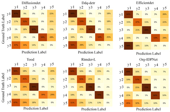 As illustrated in Figure 8, we analyzed the normalized confusion matrix, where labels y1 through y5 represent organoid0, organoid1, organoid3, spheroid, and background, respectively. The results clearly demonstrate that the proposed Org-IDPNet exhibits a significant advantage in class-wise discrimination. It achieves the highest classification accuracy across several key categories—most notably y1 (69%) and y3 (72%)—among all evaluated models, while also exhibiting a superior ability to suppress inter-class confusion.