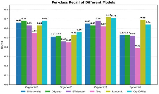 In terms of recall performance, Org-IDPNet also demonstrates highly competitive results. As shown in Figure 9, our model achieves the highest recall among all compared methods for “organoid0” (0.68) and “organoid1” (0.56), effectively reducing the missed detection rate. Although the baseline model RTMDet-L achieves slightly higher recall in “organoid3” and “spheroid”, its performance on other categories—such as only 0.53 for organoid1—is suboptimal, indicating weaker overall consistency. In contrast, Org-IDPNet maintains high recall across all categories, highlighting its superior and balanced capability to retrieve true positives. Moreover, compared with Transformer-based architectures such as Ddq-DETR and DiffusionDet, as well as classical detectors like EfficientDet and TOOD, Org-IDPNet consistently achieves better recall. These results strongly suggest that the proposed model not only excels in feature extraction, but also enables more comprehensive and reliable detection of organoid targets within the image.