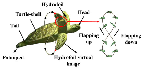A sketch of sea turtle motion is shown in Figure 1 [38]. The flipper motion is the primary power source of the turtle’s movement, with a negative head-on angle (with the incoming velocity pointing toward the positive airfoil surface) and a positive head-on angle to the relative incoming current during the flapping up and flapping down phases, respectively. Both phases of motion are horizontally driven and generate thrust, which is accompanied by lift, which causes the body to generate vertical acceleration, the magnitude of which depends on the angle-of-approach distribution. The motion of the hydrofoil tip relative to the turtle shell is in the shape of a thin “8”. Therefore, the end of the shoulder joint needs to be bent around the x–axis and y–axis, as well as twisting around the z–axis.