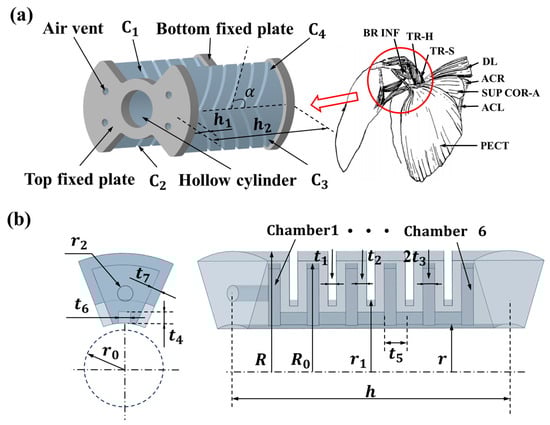 Inspired by the biology of sea turtles, the structural diagram of our designed bionic sea turtle shoulder joint SPA is shown in Figure 2a. The SPA mainly consists of four oblique chamber actuator units (, , , and ), a hollow cylindrical structure composed of a non-retractable layer, and top and bottom fixation plates. Its oblique chamber angle is , outer radius mm, total height mm, and inner radius mm. The structure and dimensions of the SPA oblique chamber actuator units are given schematically in Figure 2b, where one end of the oblique chamber actuator units contains a vent hole, and the internal chambers are linearly arranged along the axial direction of the actuator, and the chambers are interconnected with each other through air channels. Among them, the top and bottom fixing plates are fixedly connected to the four oblique chamber actuator units and the hollow cylindrical structure, which are intended to keep the hollow cylinders from being squeezed to ensure the overall deformation effect of the SPA. The parameter details of each part are shown in Table 2.