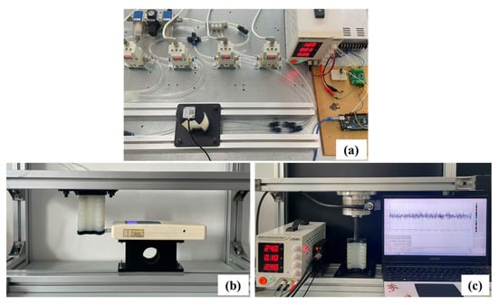 As shown in Figure 4a, the pneumatic control experiment platform is constructed. First, the host computer generates and sends control commands to the controller, and the electrical signals generated by the controller are transmitted to the signal conversion module and the relay, respectively. The signal conversion module converts the received electrical signals into corresponding voltage signals. The electric proportional valve adjusts the valve opening according to the voltage signal, thus realizing the precise control of the air pressure. Furthermore, the opening and closing sequence, as well as the driving pressure of each chamber of the SPA, can be regulated accordingly.