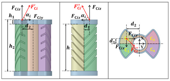When either diagonal chamber actuator is driven by pressurization, a direct force will be exerted on the hollow cylindrical structure of the confining layer. In order to systematically analyze the force and deformation response of this structure under different chamber aeration conditions, and to gain a deeper understanding of the changes in force distribution when each chamber is inflated synergistically or individually, this paper firstly conducts force and motion deformation analyses for the case of a dual-chamber synchronous filling with the same air pressure. Subsequently, on this basis, the structural deformation characteristics of single chamber inflation and more complex multi-chamber combined driving cases are further explored to comprehensively reveal the effects of different driving modes of the actuator unit on the mechanical properties of SPA. Figure 5 shows the force analysis of the SPA. The combined forces in the corresponding directions generated by one of the oblique chamber actuator units are shown in Figure 5 denoted as , , and , respectively.