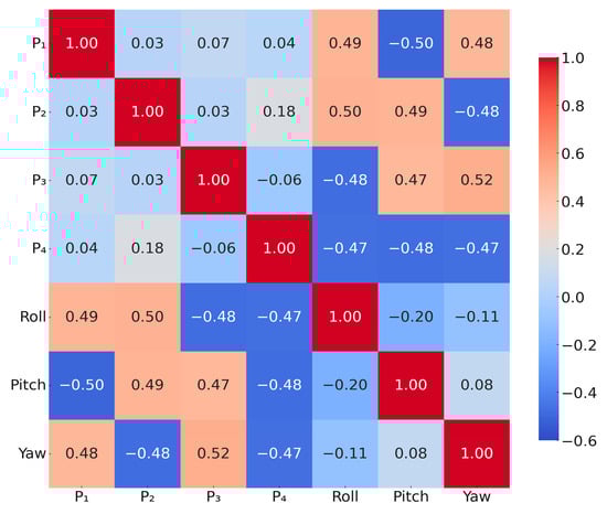 The linear correlation between the seven variables is effectively portrayed in Figure 6, corresponding to the above-mentioned pair of charging cases corresponding to force deformation. Roll corresponds to the motion around x–axis described earlier, positively correlating with and , and negatively correlating with and ; pitch corresponds to the motion around the y–axis, positively correlating with and , and negatively correlating with and ; Yaw corresponds to the motion around the z–axis, positively correlating with and , and negatively correlating with and ; motion positively correlated with and , and negatively correlated with and . These correlation results are consistent with the main motion modes and the response characteristics of each sensor after the structure is inflated, indicating that the feature selection is physically reasonable. In addition, most of the absolute values of the correlation coefficients are lower than 0.5, and no significant high covariance is observed, indicating that there is no obvious redundant relationship among these seven features, and, thus, they are suitable for use as input variables for subsequent machine learning modeling.