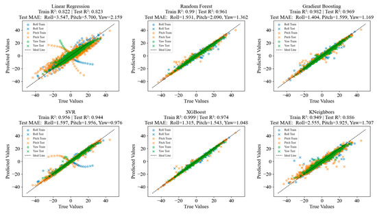 As shown in Figure 7, the six regression models (LR, RFR, GBR, SVR, XGBoost, and KNN) exhibit significant differences in predictive performance for the regression tasks of Roll, Pitch, and Yaw angles. In each subplot, the horizontal axis represents the true values and the vertical axis denotes the predicted values, with ideal fit points expected to be evenly distributed around the dashed line. The performance comparison is as follows: the test set R2 of LR is 0.823, which is clearly inferior to the other nonlinear models. The test set mean absolute errors (MAE) for Roll, Pitch, and Yaw are 3.547, 5.700, and 2.159, respectively, with the largest error occurring in the Pitch direction. A large number of points are scattered on both sides of the ideal line, and the prediction error increases significantly where the target values are more dispersed, indicating that LR fails to capture the complex nonlinear relationships in the data. The three ensemble methods (RFR, GBR, and XGBoost) demonstrate strong fitting and generalization abilities. Their R2 values on the test set all exceed 0.96, which is substantially better than those of LR and KNN, and their MAEs in all angular directions are notably lower than those of other single nonlinear models. Among them, XGBoost is particularly outstanding, achieving a test set R2 of 0.974 and MAE values of 1.315, 1.543, and 1.048 for Roll, Pitch, and Yaw, respectively—the best scores among all models—which reflects its effective balance between model complexity and generalization performance. In contrast, SVR achieves a test set R2 of 0.944, better than LR and close to the ensemble methods, but its errors in the Pitch and Roll directions are slightly higher. The plots also show somewhat more scattered points, especially in the Pitch direction, indicating that SVR’s generalization to extreme samples is somewhat inferior to that of ensemble models. KNN exhibits the lowest performance among all nonlinear models, with a test set R2 of 0.886. The MAE values indicate that its predictive accuracy is less than that of the ensemble methods and SVR, and its predictions are more sensitive to the distribution of nearest samples. The point clouds are more scattered, particularly with a significant increase in errors in the Pitch direction, which suggests that its capability to fit high-dimensional continuous variables is limited.