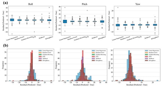 As shown in Figure 8 by the residual box plots and distribution histograms, the ensemble models, such as XGBoost and GBR, exhibit much more concentrated prediction error distributions on all three attitude angles (Roll, Pitch, Yaw), with fewer extreme errors and outliers, indicating better generalization performance. In contrast, LR and KNN display wider residual distributions and more extreme points in all motion angles. This is consistent with the previously discussed evaluation metrics (such as R2 and MAE), further confirming the superiority of ensemble learning models.