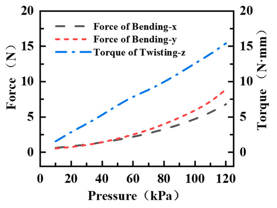 In addition, since the force comes from multiple asymmetric chambers, the resulting bending and twisting variations are driven by both the combined force and the combined torque, which exhibits nonlinear coupling characteristics between different combination modes. Using the force and torque experimental platform shown in Figure 4b,c, the maximum force and torque under pressure change can be obtained when the same air pressure is passed into the two chambers, as shown in Figure 9 below. It can be seen that the maximum force and torque increase with increasing pressure. The maximum force is 6.81N and 8.86N for Bending-x and Bending-y, and the maximum torque is 15.43 N mm.