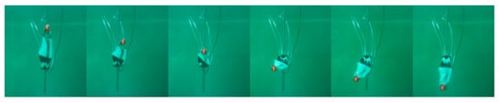 In order to further verify the actual operational performance of the pneumatic flexible bionic actuator, it is attached to the flipper for underwater drive performance verification, and an experimental test system is constructed, as shown in Figure 11. The schematic diagram of the motion of the bionic sea turtle flipper during half a cycle is shown in the figure. It is verified that the SPA, as a bionic shoulder joint, can execute the corresponding motion of the flipper limb and reach the corresponding angle through modeling. The binocular camera recognizes its end position. Therefore, SPA provides design inspiration and references for developing bionic sea turtle robots.