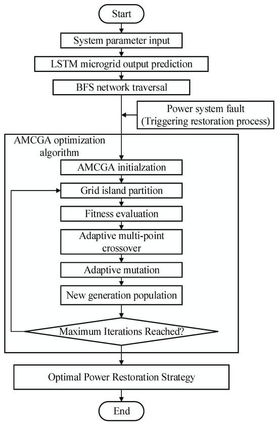 In addition to the AMCGA adopted in this paper, the main optimization algorithms for power system service restoration primarily include mathematical programming methods and artificial intelligence algorithms, represented by deep reinforcement learning. In theory, mathematical programming methods can find the optimal solution. However, this is often based on the linearization of key nonlinear constraints such as power flow, which not only introduces model errors but also causes a sharp increase in computational complexity as the scale of the power grid grows []. Although deep reinforcement learning shows potential in decision-making speed, its high offline training costs, reliance on massive amounts of data, and “black-box” nature pose practical challenges to its engineering applications. Table 1 provides a systematic comparison of these three types of algorithms across multiple key dimensions []. In summary, with its powerful global optimization capabilities and precise solutions for complex dynamic objectives, AMCGA emerges as the most appropriate and robust technical means for systematically seeking the optimal restoration strategy while satisfying all operational constraints of the power grid.