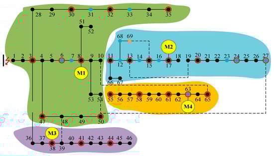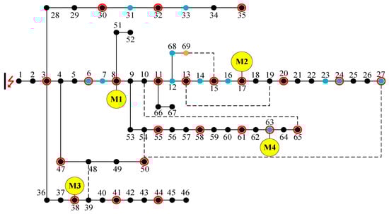 This study employs MATLAB 2016a as the simulation environment. Figure 2 illustrates the IEEE 69-node system implemented to validate the efficacy of the proposed power restoration strategy. The system incorporates four microgrids with diverse power ratings, positioned at nodes 8, 17, 38, and 63. The main grid outage scenario is scheduled from 00:00 to 23:00 on a clear day. Table 2 presents the comprehensive microgrid parameters, where red symbols indicate disconnected lines and yellow circles denote the respective microgrid locations. The dashed lines represent tie lines that function as auxiliary connections facilitating power supply within the system, enabling inter-regional power transfer and restoration between different nodes. To clarify the configuration scheme of PMU, we have marked the installation nodes with red circles in Figure 2. The nodes with PMU installed are as follows: 3, 6, 8 (M1), 11, 13, 15, 17 (M2), 20, 24, 27, 30, 32, 35, 38 (M3), 41, 44, 47, 50, 55, 58, 61, 63 (M4), 65. The primary load is represented by orange dots, and the secondary load is represented by blue dots. We use Algorithm 1 to solve the optimal power restoration strategy for this example.