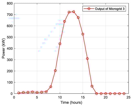 To illustrate the power generation characteristics, Figure 3 presents the forecasted power output profile of microgrid 3 throughout a complete 24 h operational period. This temporal distribution demonstrates the diurnal variation in available power resources during the restoration process.