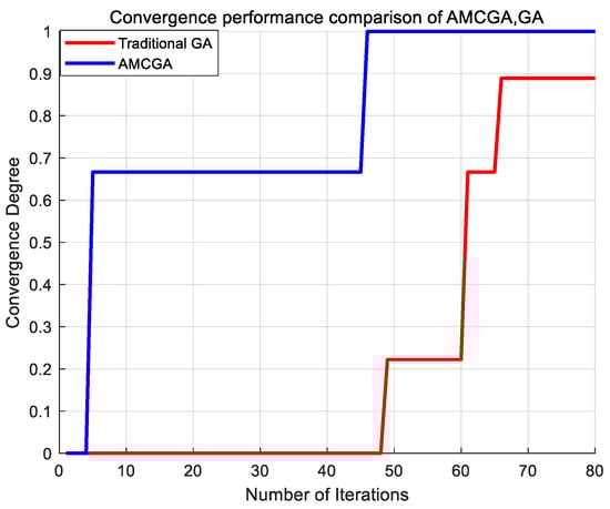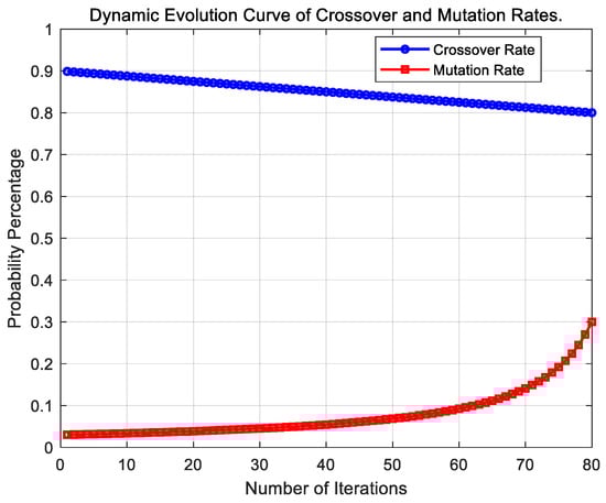 Figure 6 visually demonstrates how our AMCGA intelligently balances global exploration and local exploitation by adaptively adjusting its operator probabilities. In the initial stages, the algorithm employs a high crossover, low mutation strategy to facilitate a broad exploration of the solution space while protecting nascent high-quality genetic structures. As the iterations advance, the strategy smoothly transitions to maintaining a high crossover rate while significantly increasing the mutation rate. This shift enhances the algorithm’s capacity for refined local searching within the neighborhood of the optimum and provides the momentum to escape local optima, thereby ensuring efficient and robust convergence to the global solution.