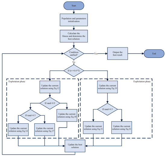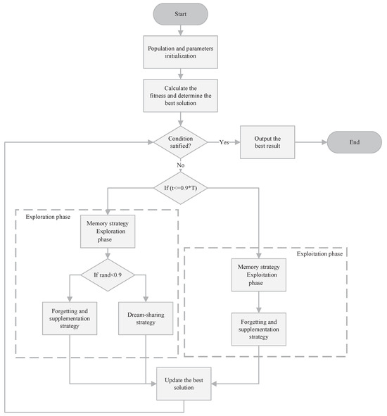 The algorithm begins by randomly generating N individuals within the search space and evenly dividing them into five subpopulations to ensure initial diversity and enable parallel local searches. The iteration counter t is initialized to 1. The fitness of all individuals is then evaluated and the best global solution is recorded to guide the subsequent memory strategy and positional updates. During the first 60% of the iterations (exploration phase), the algorithm extracts the best solution of each subpopulation and applies the memory strategy to reset all individuals in that subpopulation to their best solution, thereby rapidly exploiting promising regions. Then, it randomly switches between the expanded exploration update strategy (Equation (14)) and the narrowed exploration update strategy (Equation (17)) to balance global and local search and activates the dream-sharing mechanism (Equation (18)) to enhance diversity through inter-information exchange between subpopulations. In the remaining 40% of the iterations (exploitation phase), the algorithm focuses on the best global solution , using the memory strategy (Equation (19)) to pull all individuals back into its neighborhood and fully utilize global information. It selects between the expanded exploitation update strategy (Equation (21)) and the narrowed exploitation update strategy (Equation (22)) based on a random probability, flexibly adjusting step sizes for a finer-grained local search. After position update, boundary handling ensures feasibility. If the termination criterion is met, the final best global solution is returned. Otherwise, t is incremented and the process repeats.