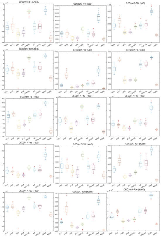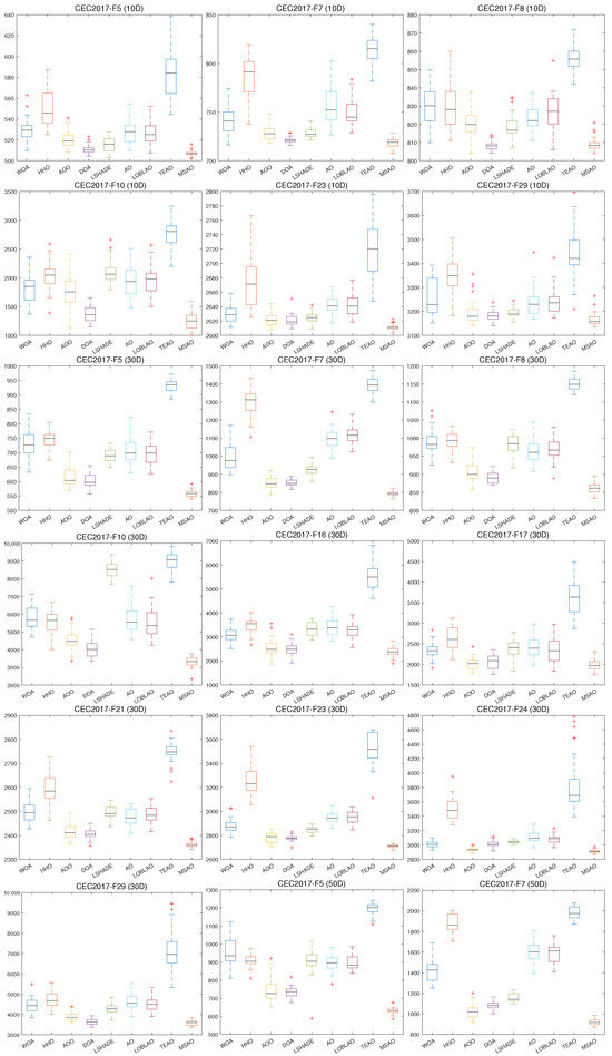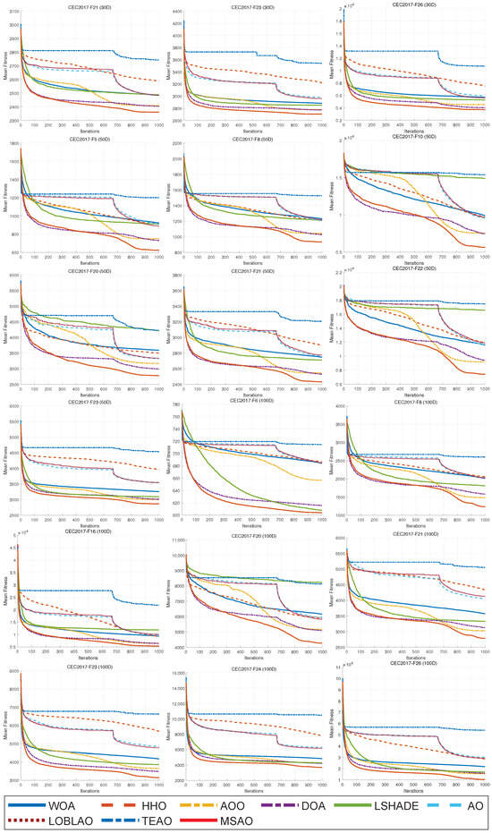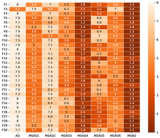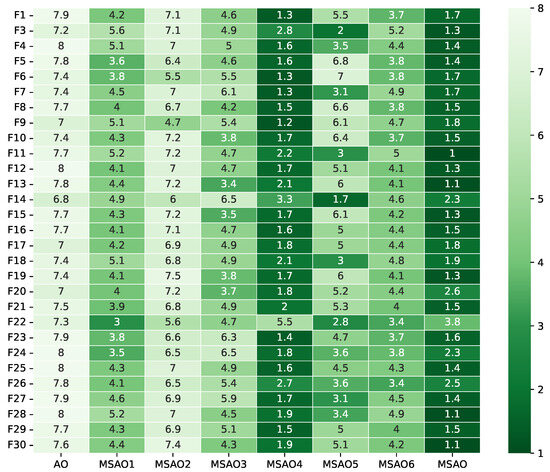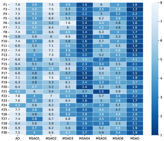 In this experiment, the MSAO is evaluated on 29 benchmark functions of the CEC2017, excluding the unstable F2 function to ensure consistency of the result [52], detailed in Table 1. All benchmark functions are defined in the search space [−100, 100], and denotes the theoretical minimum value of each test function. To assess adaptability across problem scales, we conduct experiments in 10, 30, 50, and 100 dimensions, with a fixed population size of 30 and a maximum of 1000 iterations. Each configuration is independently run 30 times to evaluate reliability. The MSAO is compared with its five AO variants and six state-of-the-art metaheuristic algorithms: the original AO [35] and its enhanced variants LOBLAO [53], TEAO [54], SGAO [55], MMSIAO [56], and IAO [57]; the classic WOA [32] and HHO [58]; the novel AOO [59] and DOA [49]; and the CEC-winning LSHADE [60]. The algorithm parameters are set according to original sources or widely accepted values, detailed in Table 2, and all methods use the same population size and iteration count to ensure a fair and rigorous comparison.