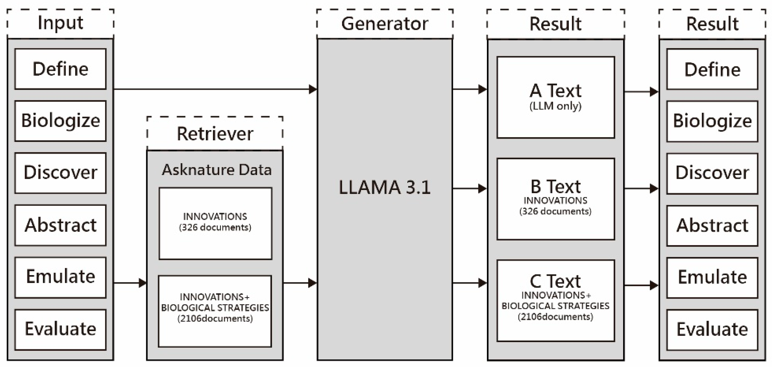 Computational tools of the experimental system. The setup combined Python-based environments (e.g., Jupyter Notebook 7.0.8, Colab) with AI-specific platforms (Ollama, AnythingLLM, Vizcom) to enable retrieval, generation, and visualization. These tools ensured an integrated workflow for implementing and evaluating the RAG-based biomimicry design framework.