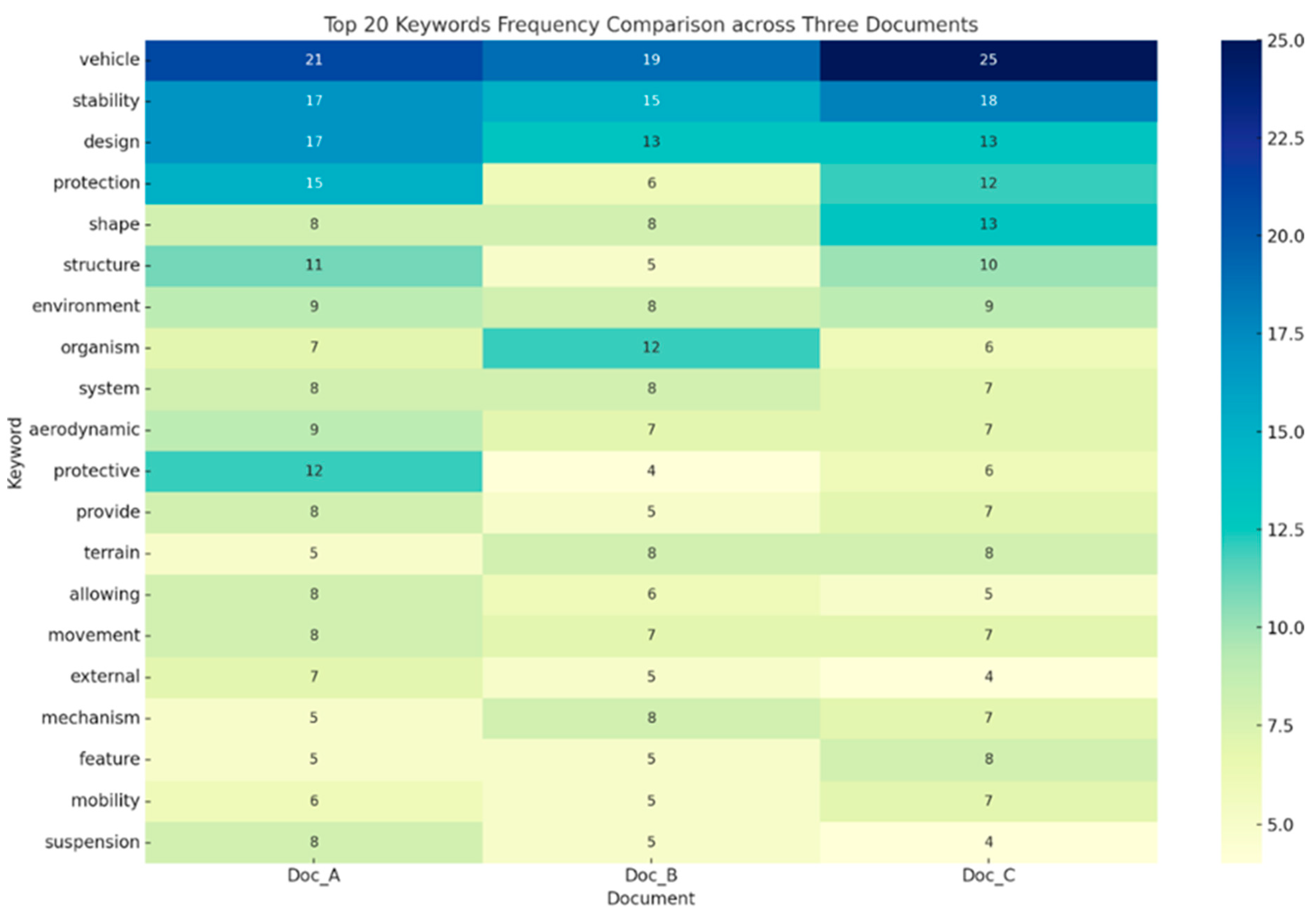 Keyword frequency heatmap of top 20 most frequently occurring terms across all conditions. Darker blue indicates higher relative frequency, while lighter yellow represents lower frequency. RAG-Large produced more domain-specific terms (e.g., “vehicle,” “stability,” “design”), whereas LLM-only relied on generic descriptors. This suggests that RAG enhances terminological precision.