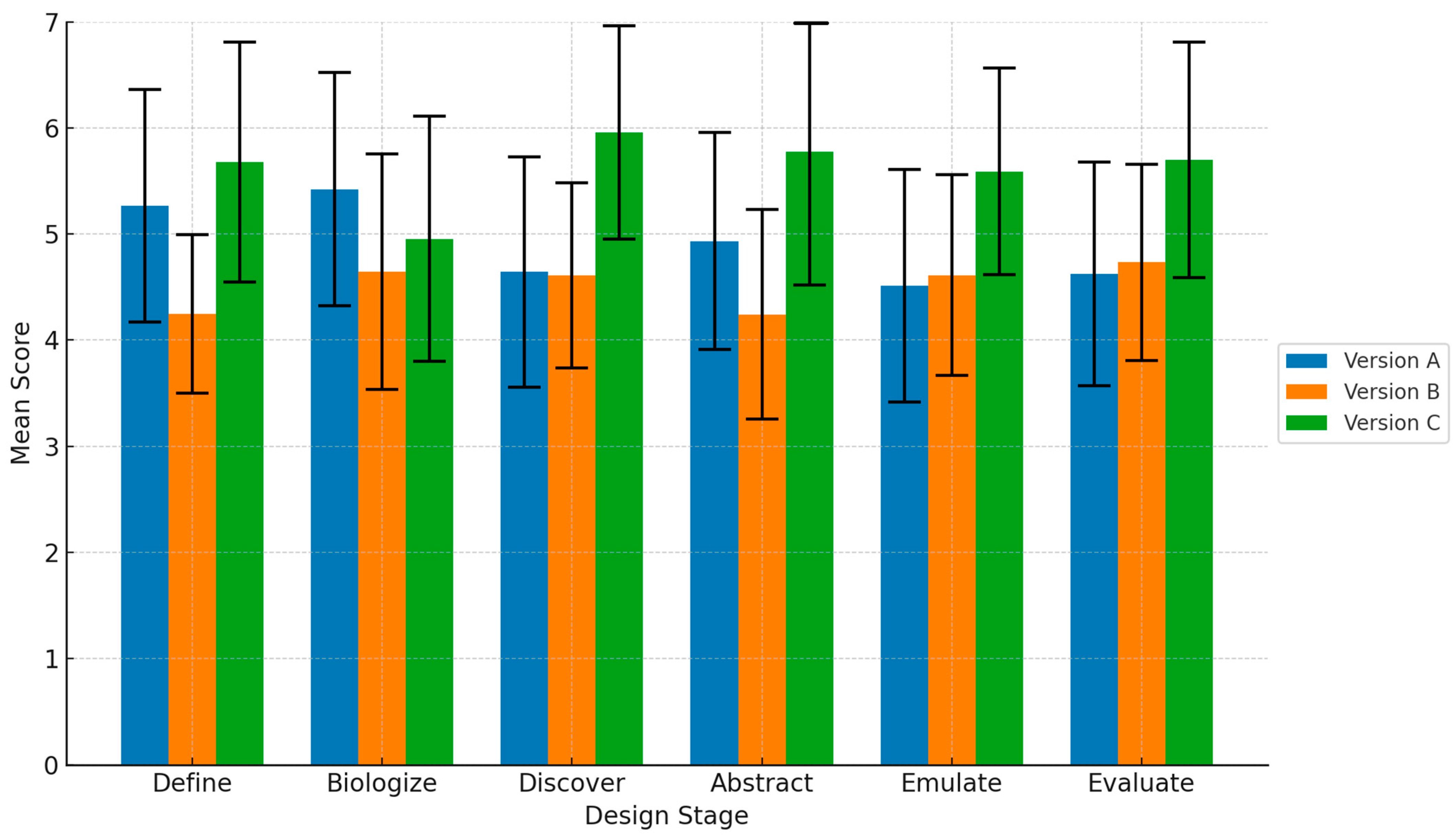 Comparison of mean scores across six BDS stages (Define–Evaluate). Error bars show standard deviations. RAG-Large outperformed other conditions, particularly during cognitively demanding stages such as Abstract and Emulate. This indicates that retrieval support is most beneficial in bridging the Discover–Abstract bottleneck.