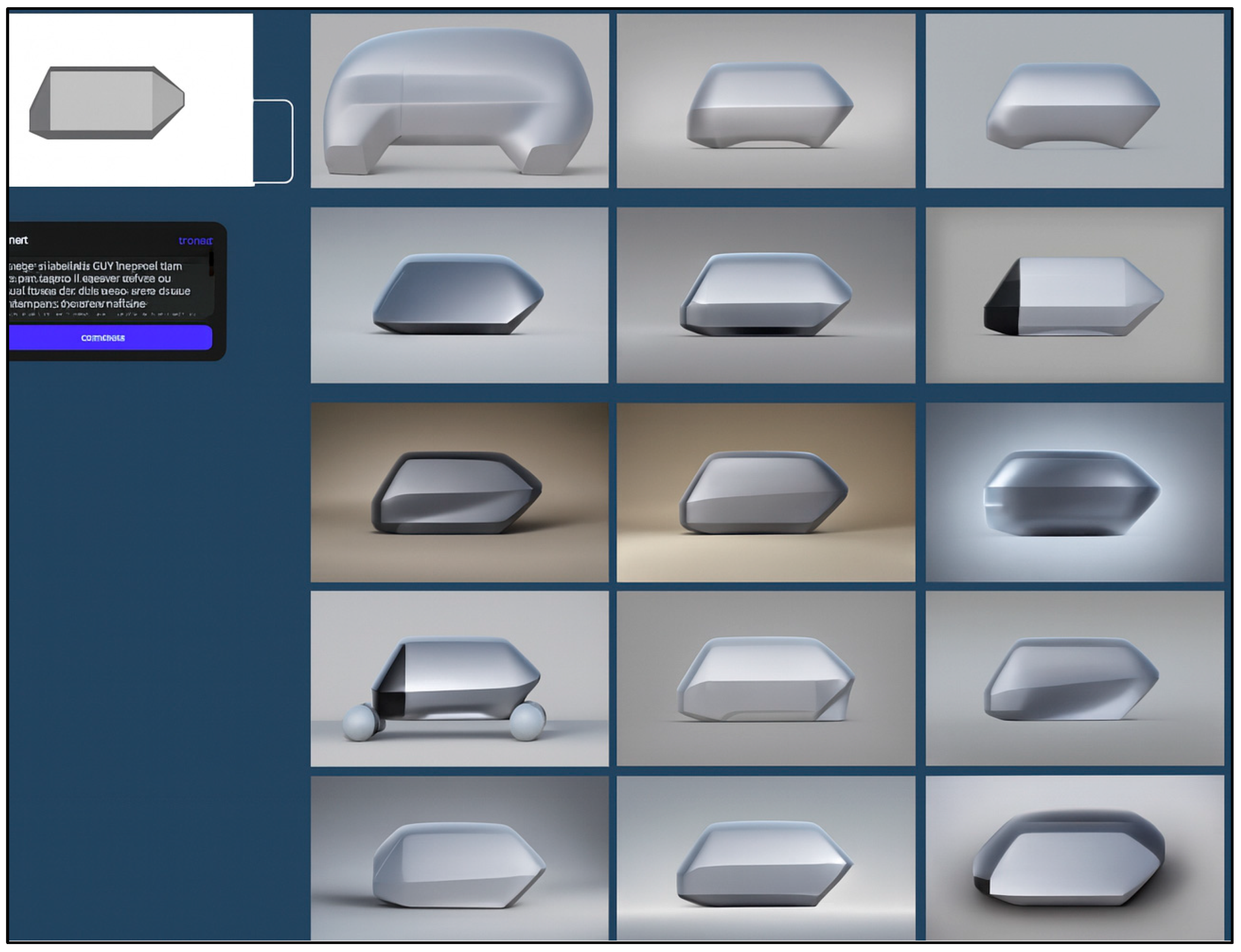 1: Basic Image Generation | Boxfish CAD side-view silhouette; design prompts emphasizing form flow and stability | Vizcom ‘Car Shading’ palette; adjusted prompt weighting | High: LLM-RAG used to generate descriptive prompts guiding form variation | Conceptual form exploration: Multiple stylized body design sketches translating natural forms into industrial vocabulary |