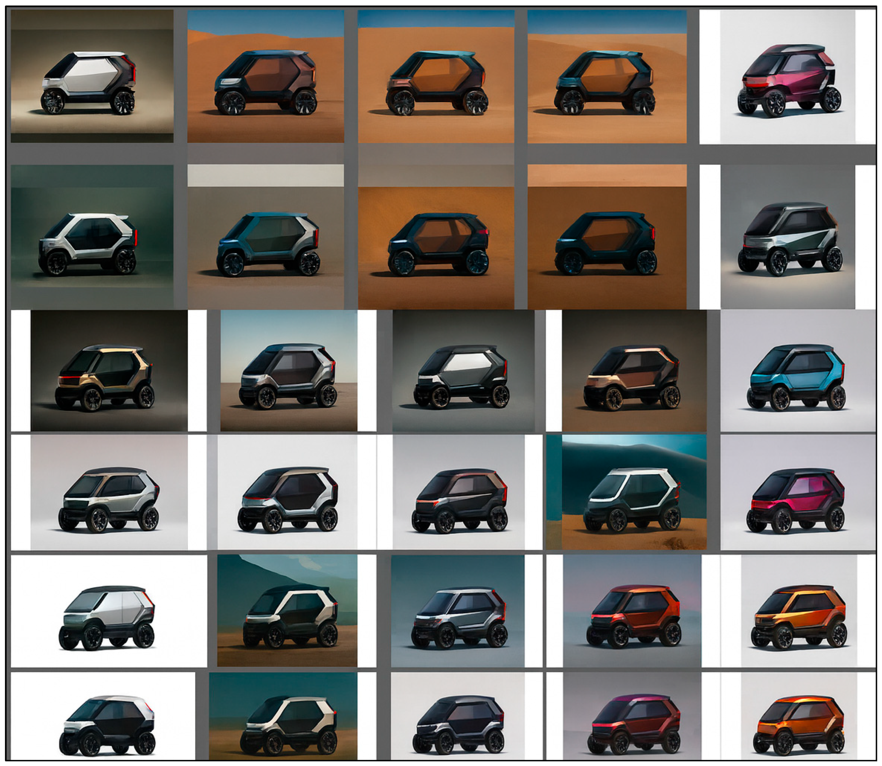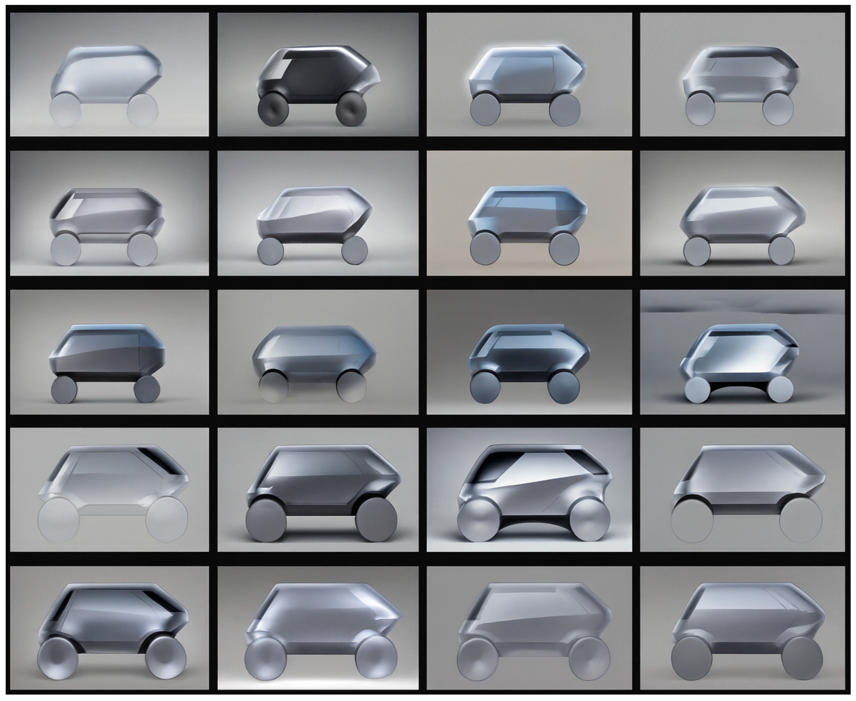 2: Functional Component Integration | Phase 1 outputs; manual addition of essential vehicle structures (windows, wheels) | Vizcom ‘Car Shading’ palette for configuration extension | Low: minimal reliance on LLM-RAG; emphasis on manual functional integration | Functional feasibility: Feasible vehicle body designs with integrated functional components |