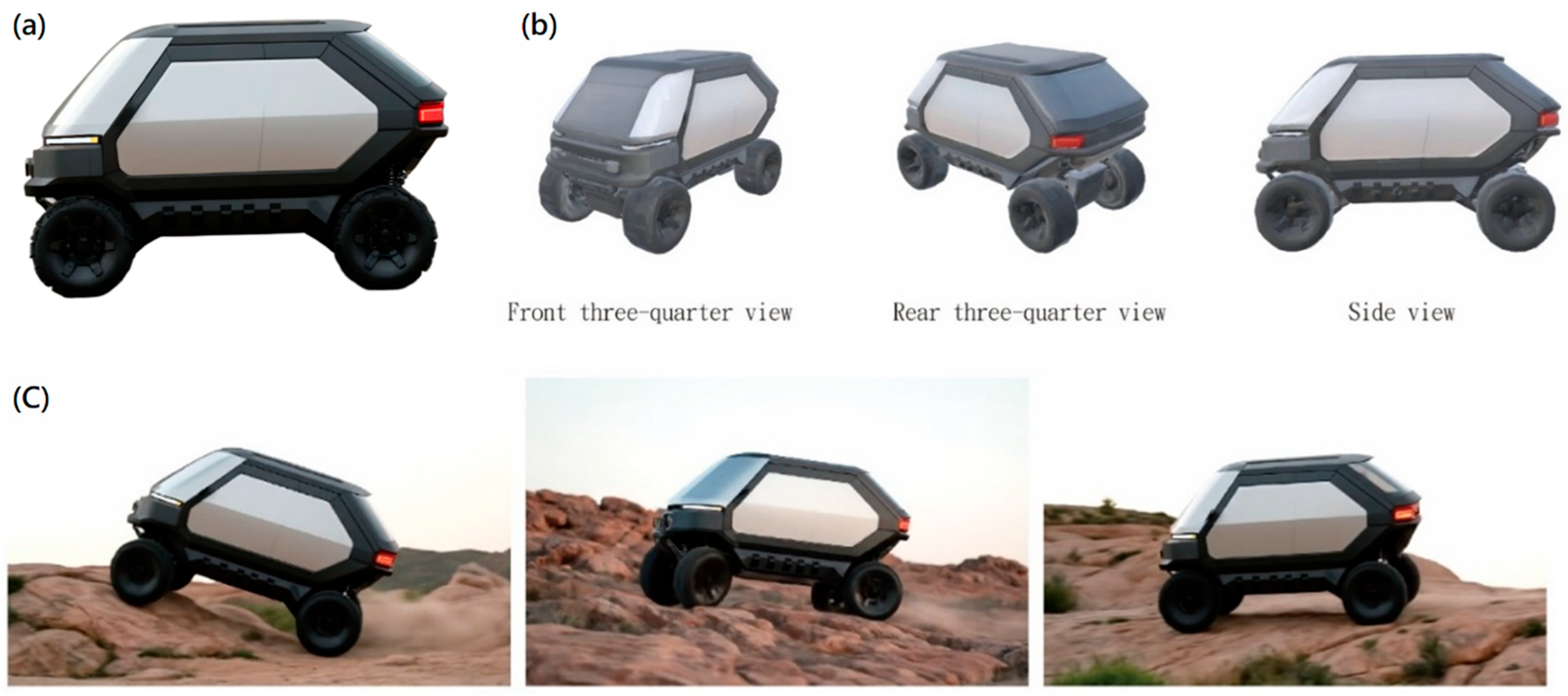 2D-to-3D model conversion and contextual visualization of the biomimetic vehicle. Vizcom-generated 3D models are shown from multiple perspectives: (a) front view and (b) side/isometric views. Panel (c) places the model in AI-generated backgrounds to support structural verification, scenario simulation, and design presentation. This stage demonstrates the feasibility of translating biological principles into manufacturable product semantics.