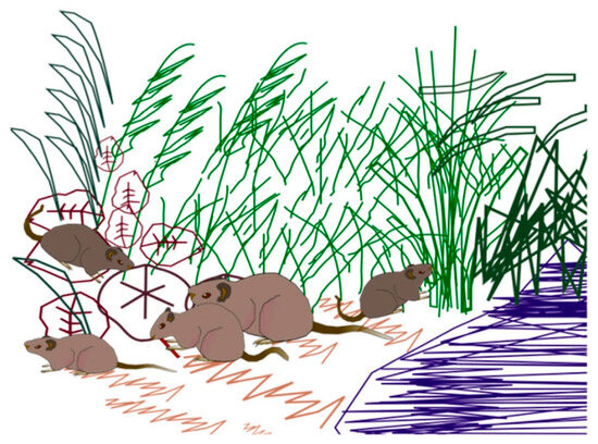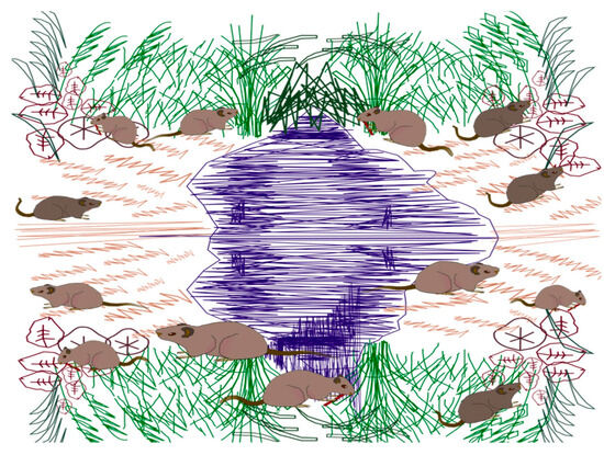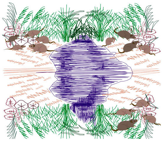 The GCRA is based on the intelligent foraging behavior and social collaboration mechanism of the greater cane rats (GCRs), which simulates their territory exploration, path tracking, and reproduction strategies to construct an efficient framework for global exploration and local exploitation in complex optimization problems. GCRs are highly nocturnal animals that primarily inhabit areas such as swamps, riverbanks, and cultivated land, with sugarcane and grass as their main diet. The GCRA simulates the dispersed foraging behavior of GCRs during the non-mating or dry season and the aggregated breeding behavior of GCRs during the mating or rainy season in balancing the ability to explore globally (search for unknown areas) and exploit locally (optimize known solutions). Figure 1 portrays the natural foraging habitat of GCRs. GCRs live near the water source in the bottom shaded areas. The whiteness of the regions and paths depicts the trails taken by the vine-like grasses, which are features of previously known food sources.