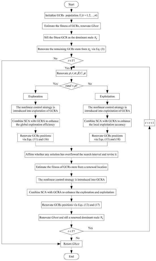 | Step 1. Initialize the GCRs population Step 2. Estimate the fitness of GCRs, renovate the global best solution () Sift the fittest GCR as the dominant male Renovate the remaining GCRs stem from via Equation (3) Step 3. while do for all GCRs Renovate , , , , , if Exploration The nonlinear control strategy is introduced into exploration of GCRA Combine SCA with GCRA to enhance the global exploration efficiency Renovate GCRs positions via Equations (11) and (16) else Exploitation The nonlinear control strategy is introduced into exploitation of GCRA Combine SCA with GCRA to enhance the local exploitation accuracy Renovate GCRs positions via Equations (13) and (18) end if end for Affirm whether any solution has overflowed the search interval and revise it Estimate the fitness of GCRs stem from a renewed location The nonlinear control strategy is introduced into GCRA Combine SCA with GCRA to enhance the exploration and exploitation Renovate GCRs positions via Equations (12) and (17) Renovate and sift a renewed dominant male end while Return |