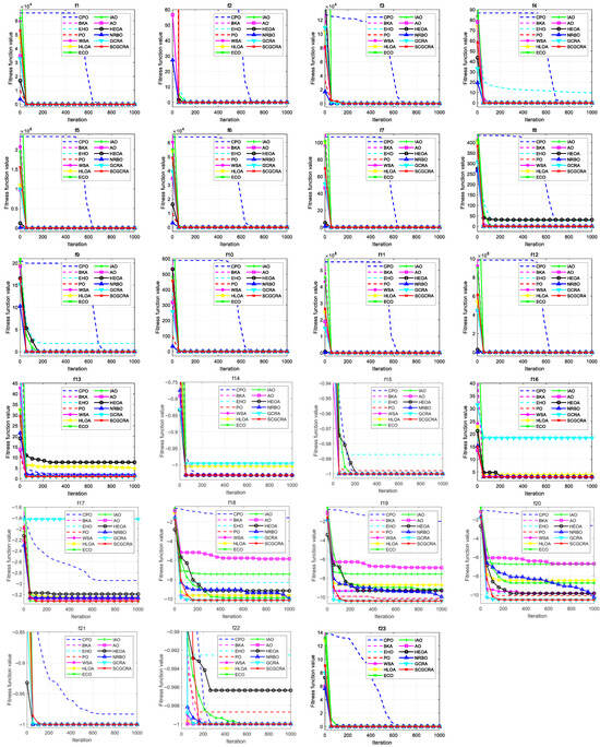 Convergence curves of the SCGCRA and comparative algorithms for addressing the benchmark functions.