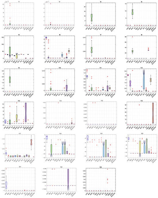 Boxplots of the SCGCRA and comparative algorithms for addressing the benchmark functions.