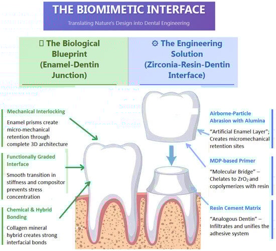 This scoping review synthesizes evidence on zirconia bonding protocols, cementation strategies, manufacturing techniques, and clinical performance. The following discussion contextualizes key findings, addresses prevailing controversies, and highlights translational implications through a biomimetic lens. The figure below represents a conceptual diagram of analogous biomimetic bonding interfaces to visually articulate the conceptual framework of a “biomimetic lens” (Figure 4).