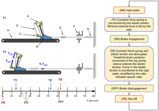 AN-EXTRA-Push structure (top left) and normal operating procedure. A: shank part of the orthosis; B: foot part of the orthosis; C: three rigidly affixed coaxial spools; D: elastic tendon; E: rigid cable; F: brake; G: constant force spring; and H: treadmill (not part of the exo). Descriptive moments T1 and T2 are depicted on the left. Key moments are placed on the timeline of a gait cycle (bottom left) and explained in a flowchart (right).