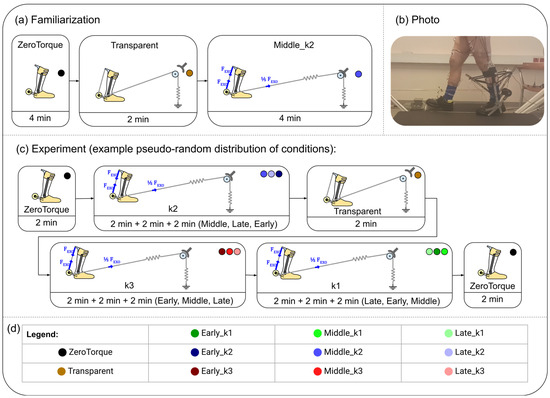 The participants familiarized themselves with the setup, first by walking on a treadmill for 10 min without the exo, then 4 min in the ZeroTorque condition, 2 min in the Transparent condition, and finally 4 min with active assistance in the Middle_k2 condition (Figure 2a).
