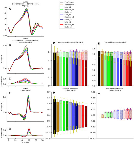 Figure 3B,C show the biological and exo contributions to ankle torque. Depending on the experimental condition, AN-EXTRA-Push assistance contributed from 10.3% (Late_k1) to 28.5% (Early_k3) of total peak ankle torque. With different timings and stiffness levels, varied and significantly different levels of assistive torque were provided by the exo (F(10, 100) = 233.03, p = 1.4 × 10−64, partial η2 = 0.959 integrated over GC and F(10, 100) = 230.86, p = 2.19 × 10−64, partial η2 = 0.958 for peaks), as seen in Figure 3D (average value calculated as integral divided by duration) and Figure 3E. All post hoc pairwise tests also show significant differences (all p < 0.001). Across all experiments, higher stiffness values (k3 > k2 > k1) and earlier timings (Early > Middle > Late) resulted in higher peak exo torque values—and therefore higher levels of assistance—with the system being much more sensitive to the investigated stiffness changes compared to timing changes.